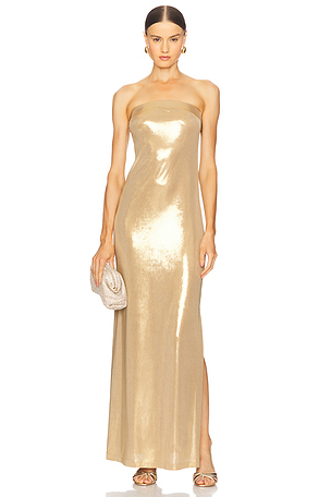 Vestido ajustado strapless con abertura lateral en color oro metálico Norma Kamali