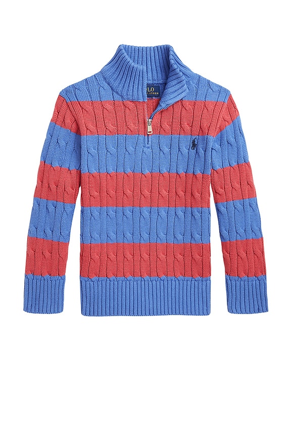 SUÉTER DE PUNTO DE CABLE CON MEDIA CREMALLERA Y RAYAS.